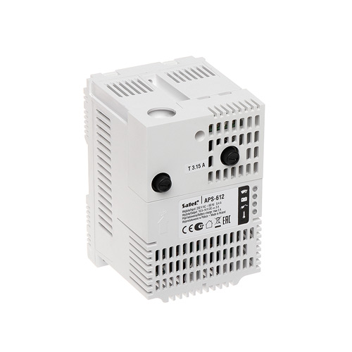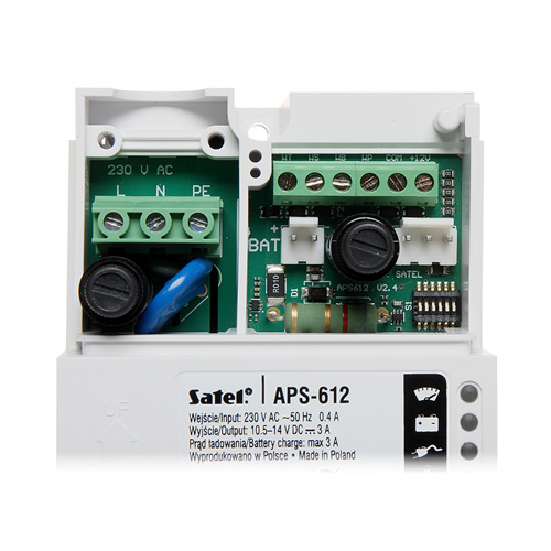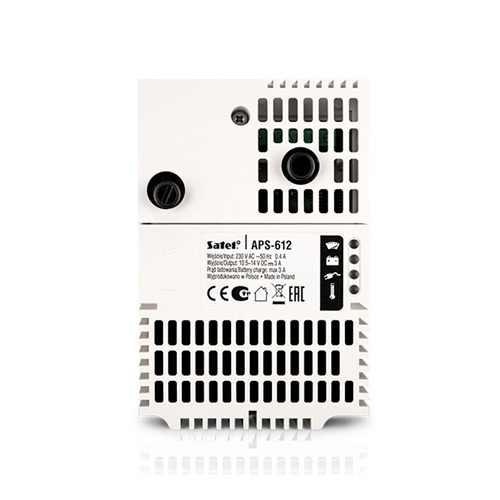 Блок живлення Satel APS-612 призначений для живлення різних пристроїв із робочою напругою 12 В DC. Оснащений спеціальним роз'ємом для підключення пристроїв Satel, наприклад, модулів розширення входів та виходів або мережевих контролерів ACCO-NT. Блок живлення має цілий комплекс захистів – від перегріву, від короткого замикання та перевантаження. Обладнаний світлодіодами, що індикують наявність мережевого живлення, живлення акумулятора та несправності. Конструкція блоку живлення дозволяє монтажу на DIN-рейку 35 мм.
