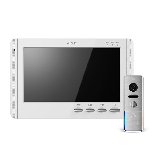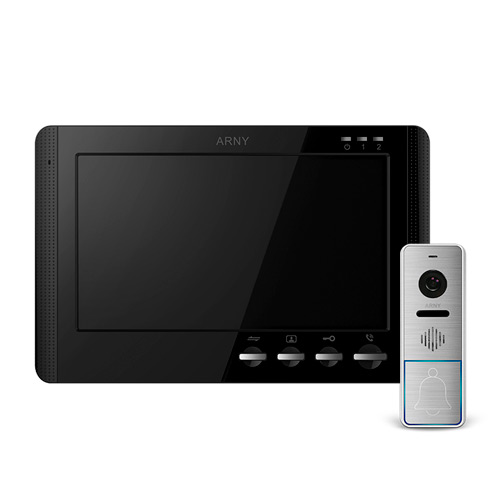 Комплект кольорового відеодомофону (монітора) ARNY AVD-709 та панелі виклику ARNY AVP-NG420. Монітор оснащений семидюймовим РК-дисплеєм з механічними кнопками управління і можливістю підключити одну або дві викликові панелі, а також одну додаткову зовнішню відеокамеру. Зв'язок із абонентом здійснюється за допомогою гучного зв'язку (hands-free). Антивандальна панель виклику має широкий кут огляду вбудованої кольорової камери високої роздільної здатності та ІЧ-підсвічування.