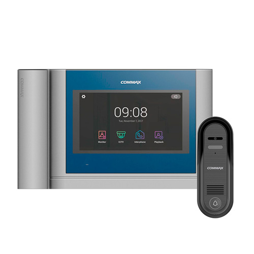 Монітор COMMAX CDV-704MHA, що входить до комплекту, обладнаний 7-дюймовим кольоровим сенсорним екраном і переговорною трубкою для зв'язку з відвідувачем. Дозволяє записати 50 фотографій на вбудовану внутрішню пам'ять, а також підтримує запис фото та відео на карти пам'яті. Виклична панель DRC-4CPHD, що входить до комплекту, має відеокамеру високої роздільної здатності (1.3 Мп), мікрофон, динамік, реле для відкривання електронного замка і світлодіодне підсвічування, що працює в автоматичному режимі.