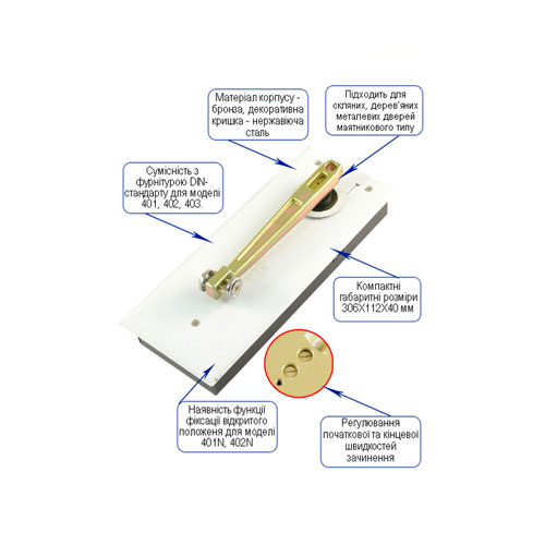 S-401 - доводжувач для підлоги від японського бренду RYOBI. Призначений для дверей маятникового типу, а також цільноскляних шириною до 900 мм та вагою до 80 кг. Відповідно до EN1154 відповідає 4-му класу. Робочий ресурс складає 300 тис. циклів.