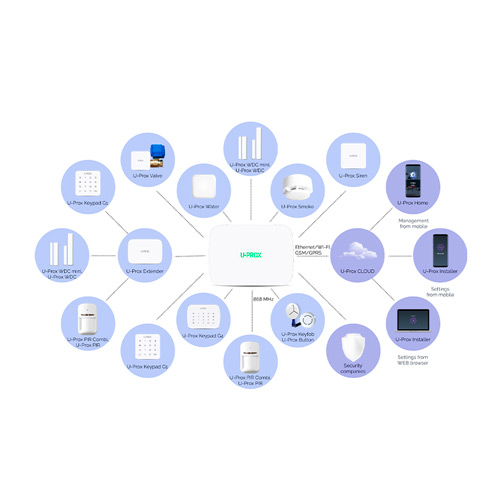 U-Prox Extender - радіоканальний розширювач, що дозволяє збільшити дальність зв'язку між бездротовою централлю U-Prox і підключеними до неї пристроями. Працює на частоті 868 МГц. Канал зв'язку 2-х сторонній, зашифрований (256 біт). Напруга живлення 12 В.