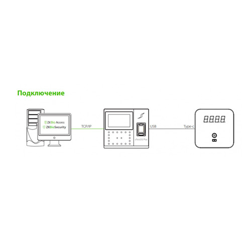 TDM95E – usb-модуль вимірювання температури. Підключається до терміналів контролю доступу або обліку робочого часу ZKTeco. Призначений для використання усередині приміщень. Вимірювання температури відбувається з відстані 1-5 см. Точність виміру становить ±0.3°C.